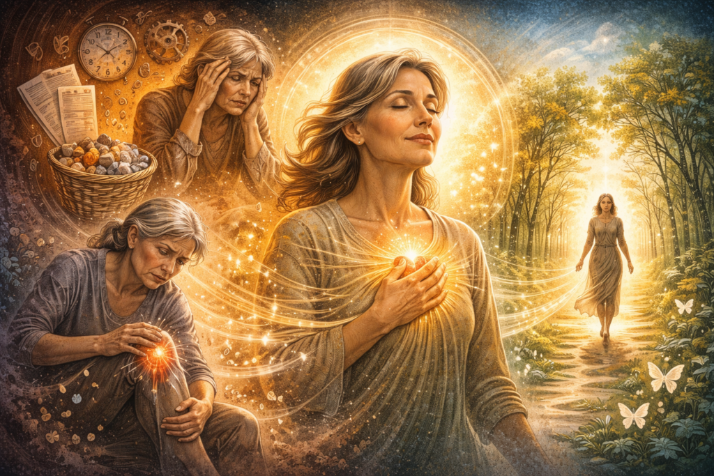 27. and of ours and through us of others, from all causes, in all ways, including being those who, through ancestral lines, the experience of womanhood, and multigenerational roles of living in service to others, entered menopause as a threshold moment in which the body ceases to sustain the function of giving at the expense of itself; accordingly, experiencing menopause not as an illness or a deficit, but as a biological and energetic closure of a stage in which life energy ceases to be directed toward sustaining cycles, relationships, caregiving, and the regulation of others; accordingly, the body halting the production of rhythms subordinated to external needs — fertility, availability, adaptation — and moving into a state in which the organism demands truth, simplicity, and congruence with itself; accordingly, the emergence of symptoms not as an error, but as the language of the body communicating: “I can no longer function in the old arrangement,” “I will no longer regulate the world at my own expense,” “my energy is returning to me”; accordingly, experiencing hot flashes, insomnia, mood swings, fatigue, and hypersensitivity as a process of dismantling former survival strategies in which the woman was the stabilizer, shock absorber, and carrier of the system’s tensions; accordingly, confronting the loss of a former identity — one based on being needed, young, fertile, regulating — and entering a stage in which value no longer derives from function, but from being; accordingly, the surfacing in menopause of unexpressed boundaries, unspoken “no’s,” silenced anger, and exhaustion — everything that had been postponed for later; accordingly, repeating an ancestral pattern in which menopause is a time of suffering, isolation, or the “end of womanhood,” rather than recognizing it as an initiation into sovereignty; and recognizing that the body takes the helm where the psyche has for too long consented to self-transgression; and entrusting to God the fear of losing youth, attractiveness, role, and significance, with the intention of receiving menopause as a threshold of truth, in which energy returns inward, boundaries become non-negotiable, and the body ceases to be an instrument of adaptation, so that a woman may dwell within herself without guilt, so that the fire of the body may become the light of consciousness rather than a symptom of struggle, so that the new stage of life may be grounded in consent rather than effort, across all dimensions, times and not only, all of this because of, among others, our and others’ actions connected with the End of the World, in the period of the year 2012, with other Ends of the World, with seeking God, with Apocalypses, Armageddons, with ends of civilizations and not only, and of ours and through us of others experiencing all the effects of this.